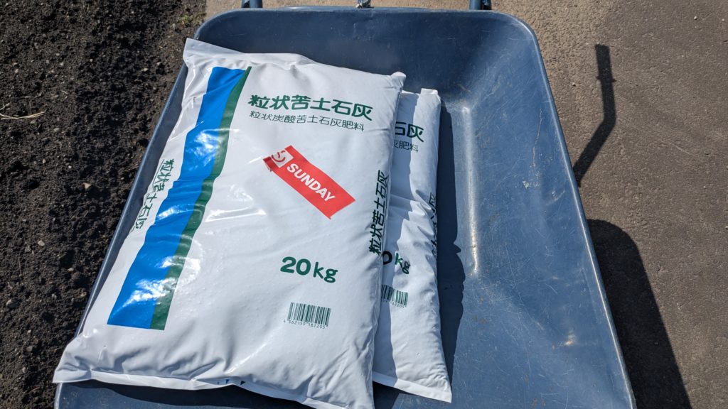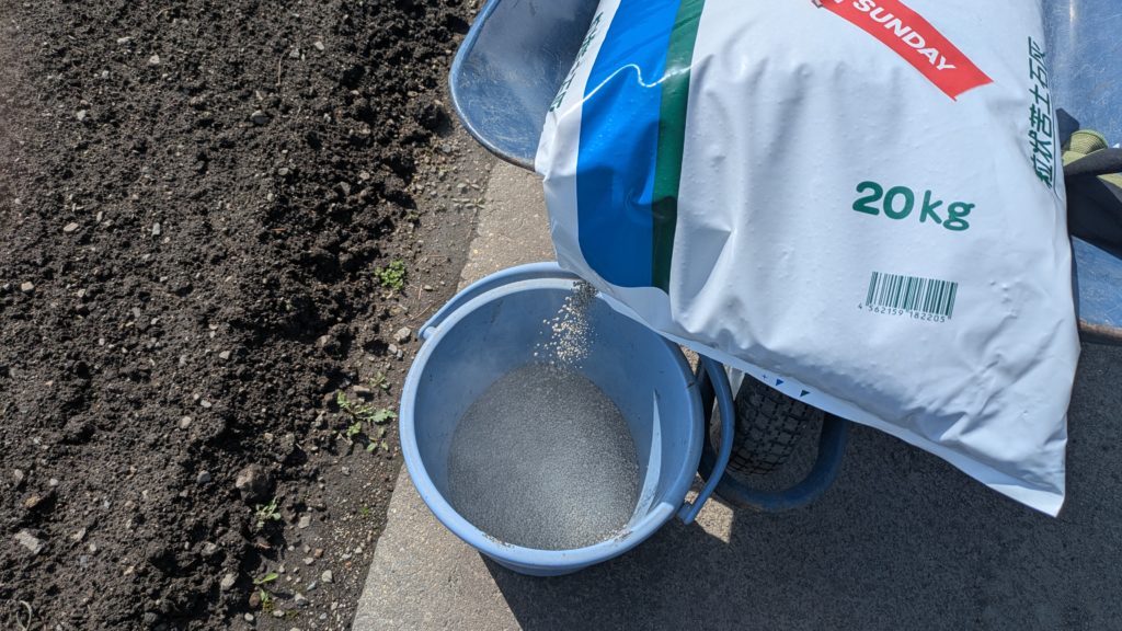 最初に土壌の酸度調整のためホームセンターから購入した石灰を撒きます!