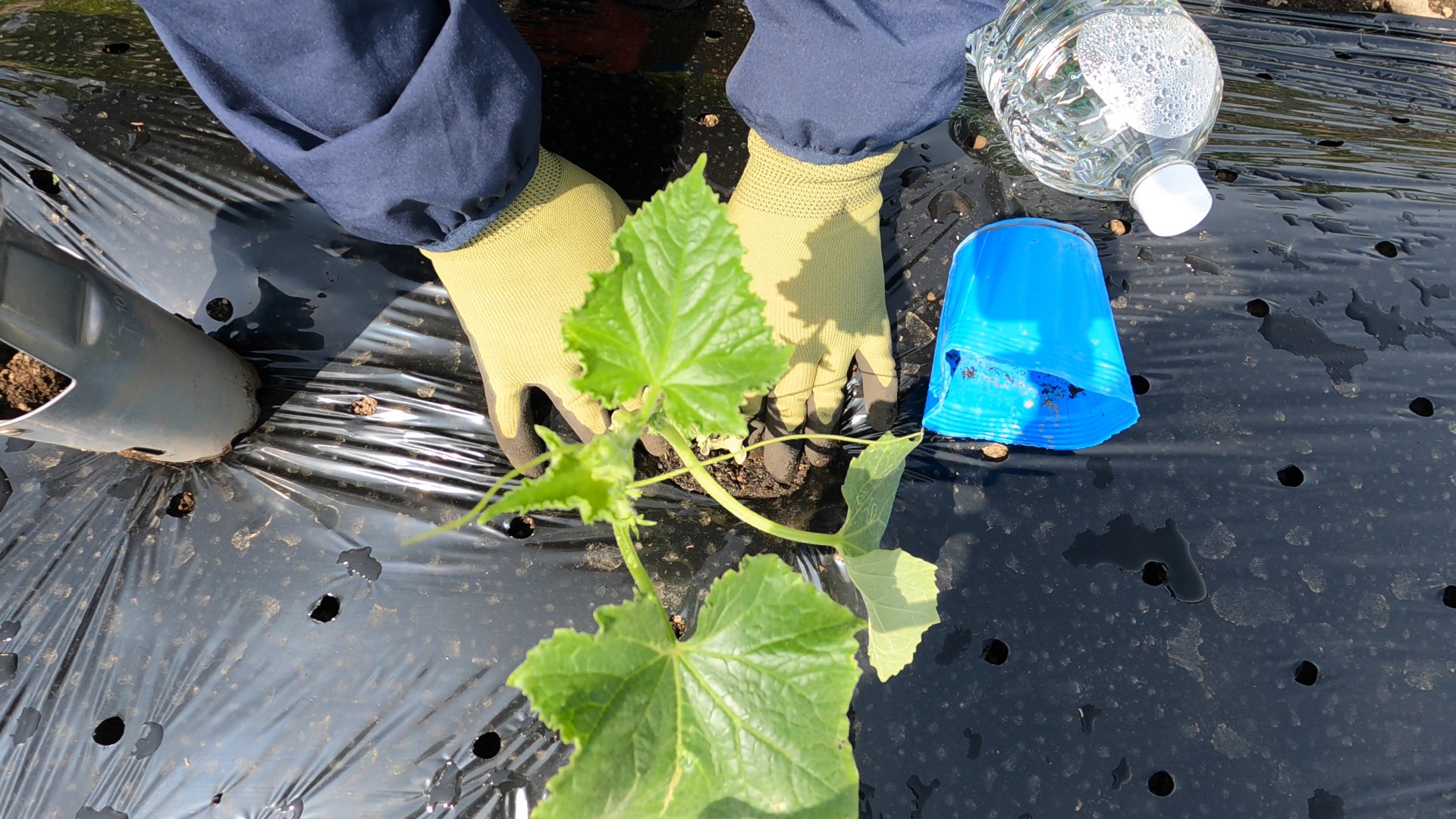まずマルチに穴をあけ棒状のもので斜めに隙間を作ります!
